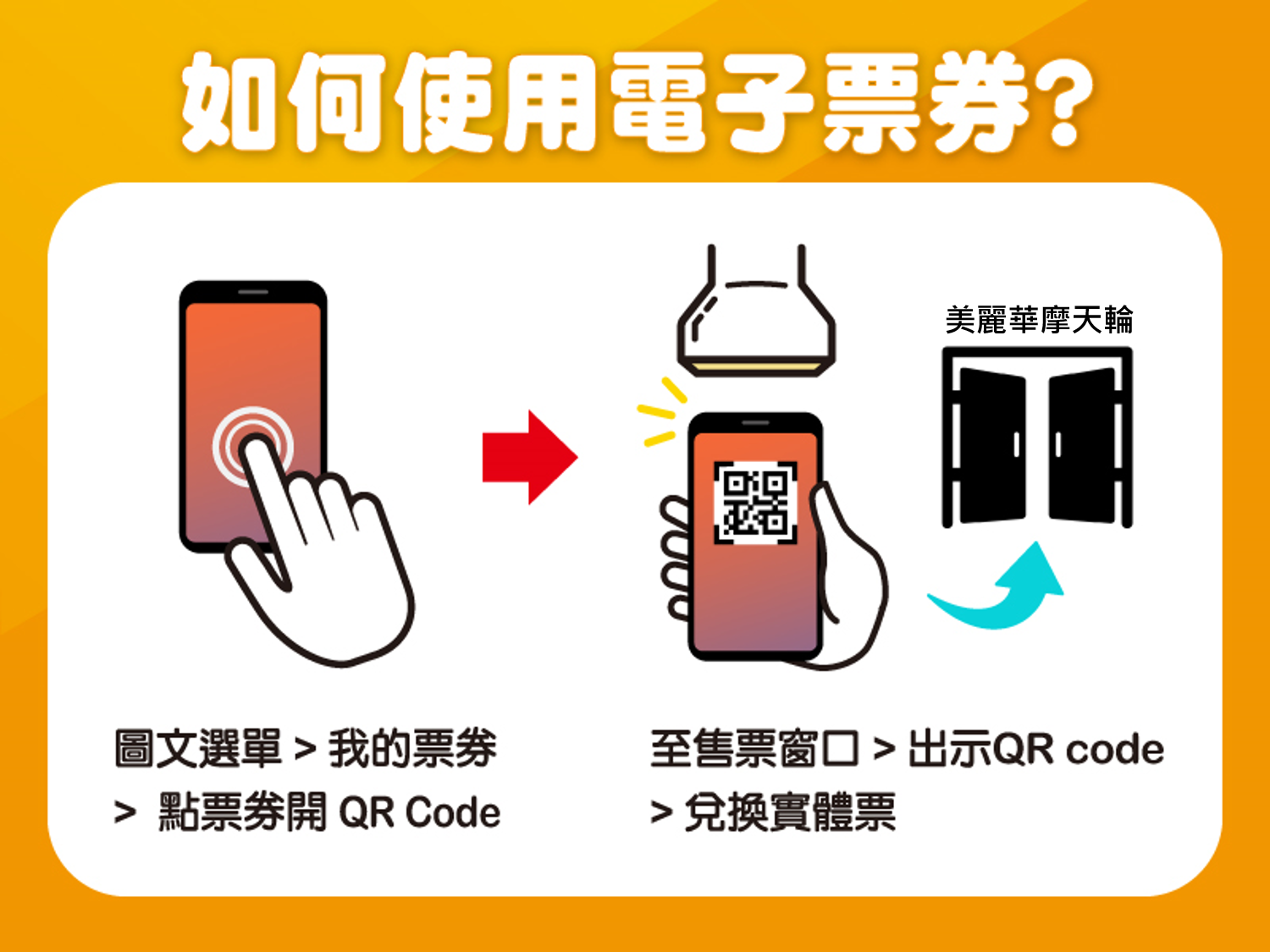 本票可搭乘美麗華百樂園摩天輪一次(不限平假日),至入口處由工作人員掃描QR Code換取票券入場。