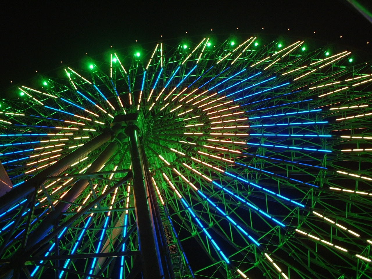 美麗華百樂園摩天輪由日本專業製造廠商打造完成,造價高達3億元,高100公尺,重達600公噸,共乘載48個車廂,並安裝了624組霓虹燈管,她讓台北城越夜越美麗。每當夜晚來臨,會依照「天樂、地彩、風舞」等三個主題上演炫麗奪目的霓虹燈光秀,在夜空中綻放變化萬千的放射狀光芒,令人駐足讚賞。